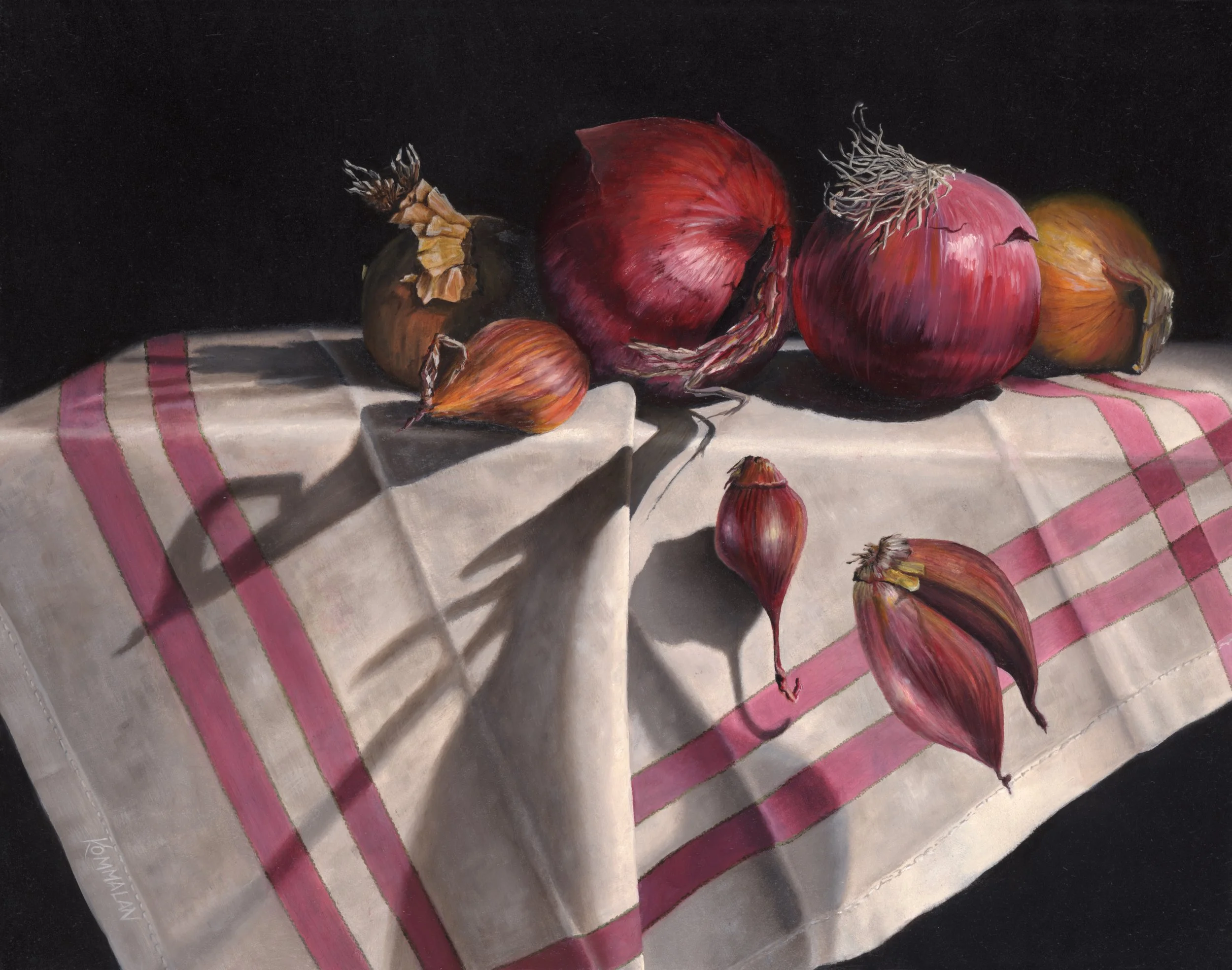 Oil on panel, 11" x 14". This is the twelfth painting in the never-ending series of still life paintings with movement. I love planning and painting these studies in shadow manipulation. Especially fun for me was the magnification the linen weave in the transparent green marble.